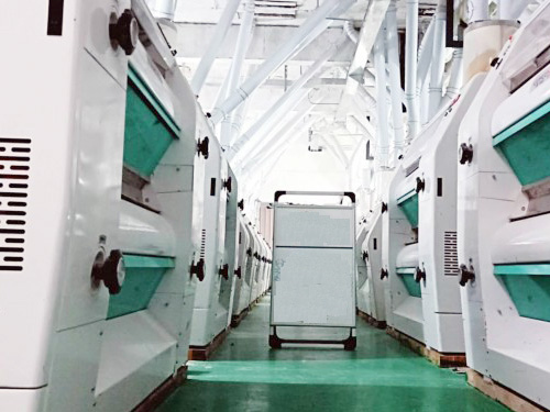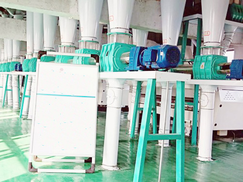 在倉儲、干法清理,制粉及面粉配粉的各道工序完全自動化,日加工小麥200噸的面粉加工生產(chǎn)線。